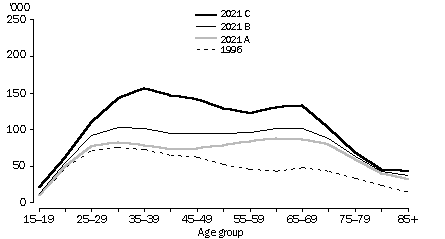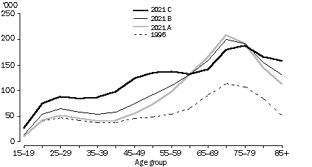 The number of people projected to live alone varies between each of the three projection series. The three series are based on varying assumptions about trends in living arrangements. In Series A the pattern of living arrangements of individuals is the same as in 1996. Thus any difference between the number of people living alone in 1996 and 2021 in Series A is solely a result of the change in the size and age structure of the projected population. In Series B and C, recent trends in the patterns of living arrangements are incorporated into the projections. In Series B the average annual rate of change in living arrangements experienced between 1986 and 1996 is applied in reducing levels (in full between 1996 and 2001, in fractions to 2011, and is then held constant to 2021). In Series C the rate of change experienced between 1986 and 1996 is applied in full throughout the projection period. LONE WOMEN GENERALLY OLDER More women live alone than men although the age profile of lone women differs from that of lone men. For women, living alone peaks in the older age groups. In 1996, 51% of lone women were aged over 65 years. This proportion is projected to be 58% in Series A, 54% in Series B, and 46% in Series C. The three series also differ in terms of the proportion of younger women who live alone. Women aged 40-59 years are projected to represent 19% of women living alone in Series A, 22% in Series B, and 27% in Series C in 2021, compared with 21% in 1996. WOMEN LIVING ALONE LONE MEN YOUNGER Lone men tend to be much younger than lone women and outnumber women in the younger age groups (aged below 50 years). In 1996 the peak age group for lone men was 30-34 years with less than one-quarter (23%) aged over 65 years. In Series A, the ageing and increasing size of the projected population is likely to push the peak age group for lone men to between 60 and 64 years. In this series it is projected that almost one-third (30%) of lone men will be aged over 65 years. Series B and C show an increasing trend for men to live alone in most age groups. Like Series A the largest increases are projected to occur in the older age groups, particularly among men aged 60-69. Series B and C project a further peak in the 35-39 year age group for men to live alone. Only one-quarter (25%) of lone men in Series C are projected to be over 65 years of age. MEN LIVING ALONE Document Selection These documents will be presented in a new window.