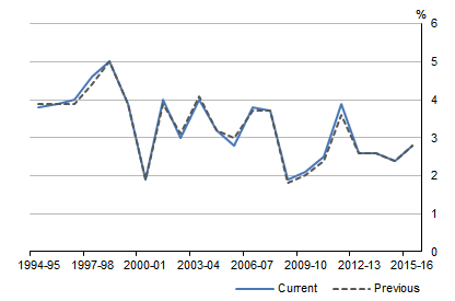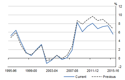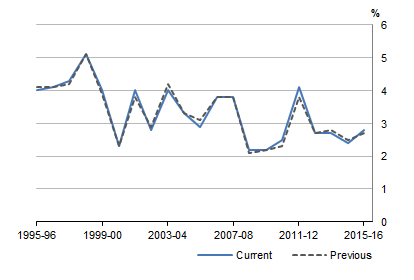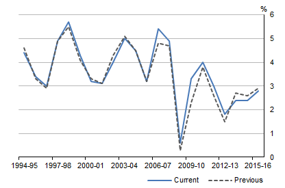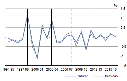 Household net saving is the difference between household net disposable income and household final consumption expenditure. The household net saving ratio was revised downwards significantly from 2008-09 onwards, mostly reflecting the impact of the revisions to household final consumption expenditure. Graph 9. IMPACT ON HOUSEHOLD NET SAVING RATIO, Current prices REVISIONS TO NET WORTH The revisions to national net worth reflected source data updates for land estimates and a correction back to 1998-99 of the real discount rate used in the net present value estimate for sub soil assets. In 2015-16 net worth was revised downward by $0.3b. Graph 10. IMPACT ON NATIONAL NET WORTH, Current prices REVISIONS TO MARKET SECTOR PRODUCTIVITY GROWTH CYCLES Productivity growth cycle peaks are determined by comparing original MFP estimates with their corresponding long-term trend estimates. Graph 11 shows the 2007-08 peak previously identified has weakened due to the full historical revisions, including revisions to GVA, capital stock, and hours worked. This data point no longer passes the criteria for a peak. However, a robust 2011-12 peak has become available, its strength supported by the 2010-11 trough. To ensure that peaks are more resilient to revisions, a three-filter approach (Henderson 11, H(11); Hodrick and Prescott, HP (1997) and Christiano and Fitzgerald, CF(2003)) was implemented in 2016 to identify cycle peaks. For more information about criteria to determine productivity growth cycle peaks, please see the feature article Experimental Estimates of Industry Value Added Growth Cycles. Deviations of original MFP from long-term trend estimates were significant for 2011-12 by all three filters (H11), HP(1997) and CF(2003), indicating a robust cycle peak for this year. Graph 11. DEVIATION FROM LONG TERM HENDERSON TREND MFP FOR MARKET SECTOR CONCLUSION There is a substantial amount of change in this edition of the ASNA. Employing new methodologies and the latest data sources ensures that the best available data are used in national accounts statistics. In most respects, the picture of the economy shown by the revised estimates is similar to previous published estimates. The impact on the movements in GDP in current price and volume terms were minor. For questions concerning the nature of the revisions, contact the National Information and Referral Service on 1300 135 070 or National Accounts by email <national.accounts@abs.gov.au> APPENDIX A - Data and Revision Triangles for selected GDP components