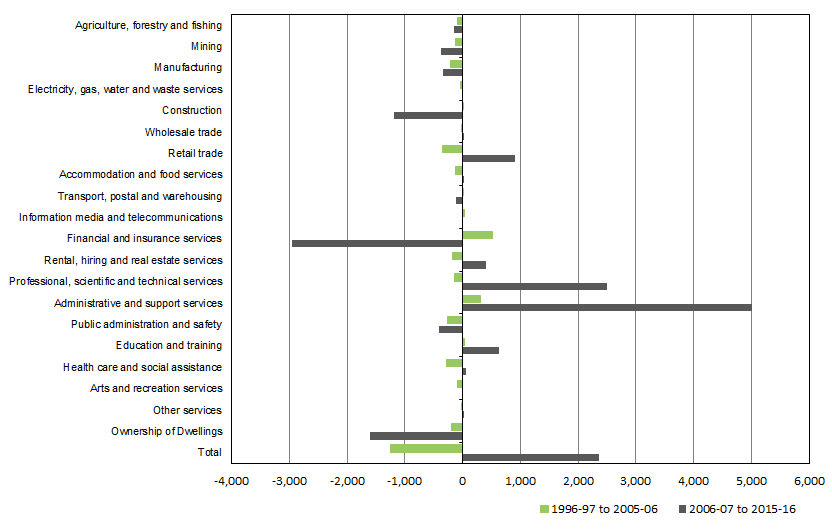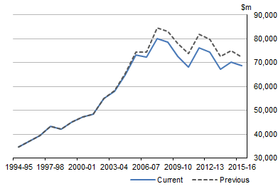 Graph 3 shows revisions to components of HFCE by COICOP. Although HFCE was revised through the entire time series, the revisions prior to 2006-07 were minor. The revisions range from a downward revision of $2.2b in 2003-04 to an upward revision of $18.0b in 2012-13. Graph 3. REVISIONS TO HFCE BY COICOP, Current Prices The upward revisions to HFCE between 2006-07 and 2012-13 were predominantly driven by an increase in expenditure on goods as a result of the implementation of the RISWIS. The main HFCE categories that were revised upward include recreation and culture (driven by audio-visuals and garden supplies), furnishings and other household equipment, clothing and footwear, operation of vehicles and alcoholic beverages. Household consumption of food was revised downwards. Household consumption of tobacco was revised from 2006-07 onwards due to a review of tobacco supply and use estimates based on data from RISWIS and tax administration datasets from both ATO and Customs. Investigations into household and business purchases of motor vehicles showed that, in recent years, household purchases of motor vehicles were understated, and conversely, business purchases were overstated. The current HFCE estimate for purchases of motor vehicles utilises car sales data sourced from the VFACTS produced by the Federal Chamber of Automotive Industries, business car purchases from AIS and state government new car registrations. This change has resulted in upward revisions to HFCE from 2006-07 and downward revisions to private GFCF of machinery & equipment. The implementation of new dwelling counts (owner occupied and rented) and rents paid estimates from the latest Census of Population and Housing: Mesh Block Counts (cat. no. 2074.0) drove the downward revisions to rent and other dwelling services. GROSS FIXED CAPITAL FORMATION The implementation of a number of methodological improvements resulted in revisions to gross fixed capital formation (GFCF). The revisions to GFCF also resulted in revisions to the estimates of capital stock and consumption of fixed capital. Additional details on the methodological changes to GFCF are provided in the Information Paper: Changes to the 2016-17 release of the Australian System of National Accounts, 2016-17 (cat. no. 5204.0.55.012). Capital formation for Machinery & Equipment The estimates of GFCF machinery & equipment (M&E) were revised downwards across the time series to more closely align with CAPEX and AIS data. In 2015-16, GFCF M&E was revised downward by $3.3b. Graph 4. MACHINERY & EQUIPMENT GFCF, Current prices Capital formation for Private Dwellings Alterations and additions, a component of Private Dwellings GFCF, was revised based on data from the BIS Shrapnel survey on the Home Improvements Market in Australia. This survey was used to update an under-coverage factor for alterations and additions that are out of scope for the Building Activity, Australia (BACS) (cat. no. 8752.0) survey. Graph 5. PRIVATE DWELLINGS GFCF, Current prices International Trade The revisions to international trade reflect a range of improvements to the model used to estimate trade in travel services as announced in International Trade in Goods and Services, Australia (cat.no. 5368.0). In 2015-16 net exports was revised downward by $0.9b. Graph 6. REVISIONS TO TRADE IN GOODS AND SERVICES, Current prices REVISIONS TO COMPONENTS OF GVA Similar to GDP, the revisions to gross value added were minimal throughout the time series. Graph 7. GROSS VALUE ADDED, Volume measures Graph 8 shows the average changes to the industry estimates of GVA between two decades: 1996-97 to 2005-06, and 2006-07 to 2015-16. The revisions to GVA between 1996-97 and 2005-06 were minimal for all industries. From 2006-07 onwards, larger revisions were observed, notably to Financial and Insurance Services, Professional, Scientific and Technical Services, Administrative and Support Services, Ownership of Dwellings and Construction. Graph 8. AVERAGE GVA REVISIONS ($m), Current price Finance and Insurance Services industry The revisions to balance sheet and income and expenditure data reported to the Australian Prudential Regulation Authority (APRA) contributed to revisions to this industry from 2002-03 onwards. In addition, Financial Intermediation Services Indirectly Measured (FISIM) has been updated back to 1994-95 due to improved methodology, and revised source data which includes an improved RBA interest rate indicator. Additionally, COE levels were benchmarked to data provided by APRA and AIS from 2003-04 onwards. Administration and Support Services Industry This industry’s output, COE and gross operating surplus deviated from the benchmark data source (AIS), particularly in the most recent years. This deviation was corrected, resulting in upwards revisions to industry GVA, beginning in 2003-04 at $0.4b, and rising to $7.5b in 2014-15. Professional, Scientific and Technical Services industry GVA was revised upwards for Professional, Scientific and Technical Services (PST), from $0.5b in 2006-07 to $3.5b in 2014-15. Similar to the Administration and Support Services industry, this revision was largely attributable to the benchmarking of COE for this industry to reflect estimates from AIS. In addition, a more detailed survey of this industry was conducted for the 2015-16 year, which provided an improved understanding of cost structures at the finer industry level. Ownership of Dwellings Ownership of Dwellings was revised to include data from the 2016 Census of Population and Housing. Census data on the number of owner-occupied and rented dwellings and rents paid for rented dwellings were used to update benchmark estimates of HFCE of actual and imputed rent. Industry estimates of Output and GOS were updated to reflect these changes. Construction industry Moderate revisions to construction industry GVA mainly reflected the inclusion of the Private Sector Construction Industry, Australia, 2011-12 (CIS) (cat. no. 87