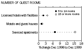 OVERVIEW The number of accommodation establishments increased over the twelve months to the end of 1999. Visitor hostels (up 5% to 649) and serviced apartments (up 8% to 880) had the largest proportional increases. These two accommodation types also showed the largest increases in capacity - up 15% or 4,252 guest rooms for serviced apartments, and up 11% or 4,206 bed spaces for visitor hostels. Significant growth also occurred in letting entities with 5 to 14 holiday flats, units and houses, with an increase of 8% or 59 letting entities, contributing an additional 7% or 452 flats, units and houses since 1998. HOTELS, MOTELS AND GUEST HOUSES AND SERVICED APARTMENTS At the end of December 1999, there were a total of 5,705 hotels, motels and guest houses and serviced apartment establishments with 5 or more rooms providing a total of 208,874 guest rooms. Establishments with 15 or more rooms accounted for 66% of the establishments and 91% of the guest rooms. The increase in the number of establishments since December 1998 was 3% while the increase in guest rooms was 4%. The number of guest rooms in establishments with 5 to 14 rooms rose by 2% to 18,795, while the number of guest rooms in larger establishments rose by 4% to 190,079. Motels and guest houses accounted for nearly two thirds (64%) of the accommodation establishments in this group, and nearly half (47%) of the guest rooms. Licensed hotels comprised 21% of establishments and 37% of capacity, while serviced apartments, the fastest growing category, accounted for 15% of establishments and 16% of the capacity. Licensed hotels There were 1,191 licensed hotels with 5 or more rooms at the end of 1999, supplying a total 77,356 guest rooms. This represented an increase in the number of establishments since 1998 of 2% and an increase in capacity of 4%. Licensed hotels with 15 or more rooms comprised 64% of the establishments and 95% of the guest rooms in this category. At the end of 1999, licensed hotels with 5 to 14 rooms had an average of 9 rooms per establishment. The average number of rooms per establishment of those with more than 15 rooms, varied from 120 rooms in New South Wales, Queensland and the Australian Capital Territory to 53 rooms in Tasmania. Motels and guest houses There were 3,634 motels and guest houses with 5 or more rooms at the end of December 1999, supplying a total of 98,298 guest rooms. One third of these had fewer than 15 rooms. Motels and guest houses showed the slowest growth of only 1% in establishments and 2% in capacity when compared with licensed hotels and serviced apartments. Motels and guest houses with 5 to 14 rooms showed most of the growth since 1998 in the number of establishments, up by 2% to be 1,221. Serviced apartments There were 880 serviced apartment establishments, providing a capacity of 33,220 guest rooms at the end of 1999. Serviced apartments showed the greatest growth in capacity between December 1998 and December 1999 with the number of establishments increasing by 8% and the number of guest rooms up by 15%. Queensland accounted for 40% of all serviced apartment establishments with an average size of 39 rooms per establishment.