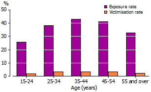SCAMS SCAM EXPOSURE AND VICTIMISATION RATES BY AGE(a) (a) Rates are calculated as a percentage of total persons in each demographic sub-population MARITAL STATUS AND COUNTRY OF BIRTH Both the exposure rate and the victimisation rate for scams was higher for married persons than unmarried persons (39.4% compared to 30.3% for exposure, and 3.2% compared to 2.5% for victimisation). Exposure to scams was higher for persons born in Australia than persons born overseas (36.5% compared to 34.1%), although there was no statistically significant difference in the victimisation rate (3.0% and 2.8%). LABOUR FORCE STATUS AND EDUCATION ATTAINMENT Employed persons were more likely to be exposed to a scam than unemployed persons (39.5% compared to 34.5%), however both were more likely to be exposed than persons not in the labour force (28.4%). In terms of victimisation, employed persons were more likely to be victims than persons not in the labour force (3.2% compared to 2.1%). Persons with a degree, diploma, or higher education were more likely to be exposed to a scam than persons with other non-school qualifications (44.8 % compared to 37.7%), however both were more likely to be exposed than persons with no non-school qualification (28.3%). Persons with a degree, diploma, or higher education and persons with other non-school qualifications were also more likely to be victims than persons with no non-school qualification (3.6% and 3.2% compared to 2.3%). PERSONAL AND HOUSEHOLD WEEKLY INCOME In terms of personal weekly income, persons earning $1,500–$1,999 and $2,000 and over were more likely to be exposed to a scam (50.8% and 48.9%) than persons earning less than these amounts. Persons earning $1,500–$1,999 were also more likely to be a victim of a scam than persons earning $0-$499 (4.0% compared to 2.6%). SCAM EXPOSURE AND VICTIMISATION RATES BY PERSONAL WEEKLY INCOME(a) (a) Rates are calculated as a percentage of total persons in each demographic sub-population Persons in the highest quintile of equivalised household weekly income were more likely to be exposed to a scam (45.7%) than persons in the other quintiles. Persons in the lowest quintile were less likely to be a victim (2.3%) than persons in the third (3.5%), fourth (3.4%), and highest (3.7%) quintiles. SCAM EXPOSURE AND VICTIMISATION RATES BY EQUIVALISED HOUSEHOLD WEEKLY INCOME(a)(b) (a) Rates are calculated as a percentage of total persons in each demographic sub-population (b) For information on equivalised household weekly income, see Explanatory Notes 32–36