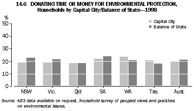 Australians who did not nominate the environment as their most important social issue were asked if they were concerned about environmental problems; in 1999 some 69% indicated that they were. The proportion of people expressing concern for the environment has declined slowly since 1992 (graph 14.3). People with higher incomes and more education are more likely to express concern for the environment (ABS 1996). However, higher household incomes can also increase environmental pressures because of the link between affluence and increased consumption of resources and waste production (Yencken and Wilkinson 2000). Donating time and money to environmental protection A study of the proportion of households donating time or money to environmental protection between 1992 and 1998 found an overall decline in the proportion in every State and Territory (graph 14.4). States and Territories that showed the largest falls were the Northern Territory (by 16%), the Australian Capital Territory (13%), Queensland (12%), and Western Australia (11%). New South Wales showed the smallest fall (5%) (Alle, Aravena and Henty 2001). The study also compared households located in the capital city of each State with those in the rest of the State (the comparison could not be done for households in the ACT and NT). It found that there were no large differences, in 1992 or 1998, in the proportions of households in the two categories donating time or money (graphs 14.5 and 14.6). Household waste management Household recycling Household solid waste is defined as waste from domestic premises; it includes household refuse, garden waste and other discarded materials, such as disused furniture. An important response to household waste is recycling. Household recycling has increased in Australia during the nineties: in 1992 around 85% of people recycled some items of waste; by 2000 this had risen to about 97%. Paper, old clothing, plastic bags and glass were the items most commonly recycled (graph 14.7). Only a small proportion of Australian households (just under 7% in March 2000) recycle all the waste items that can be recycled. While recycling rates have improved, more household waste still goes to landfill than is recycled; an audit in 1997 found that the average Australian household produced 15.7 kg of waste for collection each week (Beverage Industry Environment Council 1997). This comprised 11.9 kg of garbage, 3.1 kg of recyclables, 0.2 kg of contaminants and 0.5 kg of green waste. Recycling behaviour in Australia is different for different types of households. For example, one person households recycle less than all other types of households (graph 14.8). The most common reason provided by the 93% of Australian households that did not fully recycle in 2000 was a lack of recyclable materials in their waste (around 73% of the households not fully recycling). The next most common reason cited by households was the absence of recycling services or facilities; households from the Northern Territory were the most likely to select this reason for not fully recycling (graph 14.9). Only a small proportion of households (around 3%) in Australia recycled no waste items at all in 2000; this proportion has fallen in every State and Territory since 1992 (graph 14.10). National targets for minimisation of solid waste While recycling of solid waste by households is important, waste minimisation by all sectors has been seen by policy makers as the key to reducing the environmental pressures arising from solid waste going to landfill. In 1990 the Australian and New Zealand Environment and Conservation Council set a national target of a 50% reduction in waste going to landfill by the year 2000, based on 1990 per capita levels. This target has not been met, and it is possible that the levels of waste going to landfill have not been reduced at all (the uncertainty stems from a lack of consistent national data) (Chalkley Consulting and Global Environmental Consulting 2000). Estimates of household waste produced in Australia in the early nineties were around 400 kg per person per year (OECD 1999). Total solid waste going to landfill in Australia in 1996-97, however, was around 1,100 kg per person per year (total solid waste includes waste associated with councils servicing residential areas as well as commercial, industrial, construction and demolition waste) (ABS 1998). As the construction and demolition industries are thought to generate up to 40% of all solid waste going to landfill in Australia, businesses in these industries, in partnership with government, have initiated and funded their own improvements to solid waste management (Environment Australia 2000). Assessing the performance of the household sector in waste minimisation remains problematic. Household hazardous waste Households accumulate hazardous waste, such as garden chemicals and paint products. In 2000 a smaller proportion of households (21%) took their household hazardous waste to a dump or central collection point than in 1996 (30% of households). This decline was despite an increase in households' awareness of the availability of facilities in their area for the safe disposal of household hazardous waste (37% awareness in 2000 compared to 31% in 1996).