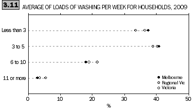 On average, most Victorian households washed five loads or less of washing a week. A small proportion (3.6%) washed 11 or more loads a week. Three-quarters (77%) of persons living alone washed less than three loads of laundry each week. Households with six or more persons and couples with children had relatively high proportions of households that washed 6 to 10 loads a week (55% and 41% respectively). Households with the lowest household income (per annum) were more likely to wash less than 3 loads per week (62%) than households with the highest income (19%).