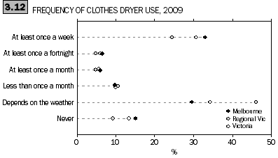 34% of Victorian households varied their use of the clothes dryer depending on the weather. Households in regional Victoria were more likely to vary using their clothes dryer depending on the weather or season (46%). 31% used their clothes dryer at least once a week while 13% of Victorian households never used their clothes dryer.