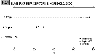 Across Victoria, 74% of households had one fridge and 26% (543,800 households) had two or more. A small percentage had three or more (1.7%). Regional Victoria had a higher rate (32%) of households with two or more fridges than Melbourne (24%).