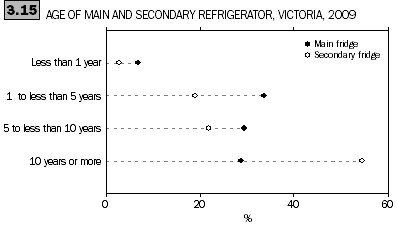 Few Victorian households had a main or secondary fridge less than one year old (6.9% and 2.8% respectively). Of those Victorian households with secondary fridges, most (55%) had secondary fridges that were 10 years old or more.