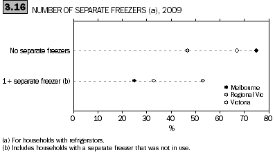 Victorian households were more likely to have a separate freezer if they had one fridge (21%) compared with households with two or more fridges (12%). Households with one fridge were more likely to have a separate freezer if they had a lower income. A quarter of households with incomes of less than $25,000 had one or more separate freezers, but only 15% of households with an income of $110,000 or more had a separate freezer. The proportion of households with two or more fridges and a separate freezer differed by household size. 4.0% of one person households had two or more fridges and a separate freezer, but 20% of six or more person households had the same. Households in regional Victoria also had a greater rate of two or more fridges with a separate freezer at 21%, compared to Melbourne's 8.8%.