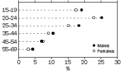 Source: ABS 2000 Labour Mobility Survey. Age and sex People are more likely to change employer at particular stages in their working lives. In general, younger people at a formative stage in their career, without family commitments, or who may be working part-time while studying, are more likely to change employer or business. After the ages of 20-24 years the likelihood of changing employer decreases. In the 12 months to February 2000, those in the 20-24 year age group had the highest proportion changing employer, with 270,500 or almost one in four people changing employer. This relatively high level of change for workers in this age group is partly the result of a large proportion completing their formal education. As a large number of students combine study with part-time work (see Australian Social Trends 2001, Combining study and work), the completion of a qualification would often involve a move from part-time or casual work which does not require qualifications, to full-time work, usually with a different employer. In the year ending February 2000, over half of all 20-24 year olds who were working part-time in February 1999, and who changed employer or business, moved from part-time to full-time work. People aged 35 years and over were the least likely to change employer, with only 10% of 35-44 year olds, 7% of 45–54 year olds and 4% of 55-69 year olds changing employer in the year to February 2000. These lower proportions may be a reflection of more established careers and increased family and financial commitments among people in these age groups. The proportion of people changing employer across age groups is similar for men and women, but men are slightly more likely to change across most age groups. There was also a difference in the proportion of men who were married with dependent children who changed employer (11%) compared with women (8%). PROPORTION OF PERSONS(a) WHO CHANGED EMPLOYER OR BUSINESS(b), 2000 (a) Persons who worked at some time during the year ending February 2000. (b) In the year ending February 2000. Source: ABS 2000 Labour Mobility Survey. Occupation and industry For a large proportion of people, changing employer or business is also accompanied by a change in industry and/or a change in occupation. There were around a million people who were working in both February 1999 and February 2000 who changed employer during this period. Of these, 486,000 workers, or almost half of those who changed employer, also changed broad industry group, while 384,200 workers changed broad occupation group. There were 290,200 workers who changed employer who also changed both occupation and industry. The tendency to change employer differed across occupations, with the highest proportions of people changing employer occurring in the lower skill level occupations (with the exception of Professionals, 11% of whom changed employer). This reflects a tendency towards shorter job duration in these occupations.1 In the year to February 2000, the occupations for which people were most likely to change employer were Labourers and related workers (15%), Elementary clerical, sales and service workers (15%), and Intermediate clerical, sales and service workers (14%). The occupation group with the lowest proportion of people changing employer was Managers and administrators (6%). OCCUPATION OF PERSONS WHO CHANGED EMPLOYER OR BUSINESS(a), 2000