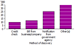 IDENTITY THEFT VICTIMS OF IDENTITY THEFT, How incident was discovered (a) Includes debt collectors and don't know responses. The most common known way that victims' personal details were obtained in the commission of identity theft was in person (28.3% of victims), followed by email/internet (10.0%), although nearly half of all victims (44.0%) reported that they did not know how their personal details were obtained. VICTIMS OF IDENTITY THEFT, How personal details were obtained (a) Includes telephone and post. Just under two-thirds of victims of identity theft in the 5 years prior to interview reported the incident to an agency (65.5%). An estimated 37.2% of victims reported the incident to the police, 31.9% reported it to a business, and 29.1% reported it to another agency. Just over a quarter (26.9%) of all victims of identity theft in the 5 years prior to interview had incurred financial losses as a result of the incident(s), with 24.1% losing $10,000 or less, and 2.8% losing more than $10,000.