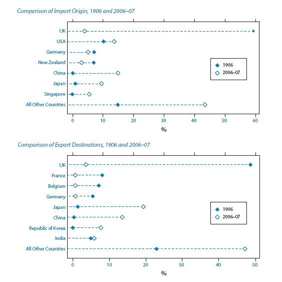 International trade statistics were first published by the Commonwealth Bureau of Census and Statistics in 1907, for the year 1906.