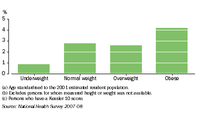 Long-term health conditions High blood cholesterol High blood cholesterol is also a major risk factor for coronary heart disease and stroke by causing blood vessels that supply the heart and other parts of the body to become clogged. For most people, saturated fat in their diet is the main reason for elevated blood cholesterol levels. Physical activity and a healthy diet play an important role in maintaining a healthy blood cholesterol level. One in ten men who were obese had high blood cholesterol levels (10%), almost double that of normal weight men with high blood cholesterol levels (6%). Similarly, around twice as many obese women had high blood cholesterol levels (9%) compared with women of normal weight (4%). Osteoarthritis Osteoarthritis is a degenerative condition caused mainly by accumulated wear of the cartilage that cushions the ends of bones where they meet to form a joint. As the cartilage degenerates, the normal functioning of the joint becomes disrupted which causes pain, stiffness and limited activity. The condition mainly affects the hands, spine and weight-bearing joints such as the hips, knees and ankles. Excess body weight is one of the risk factors for osteoarthritis. The prevalence of osteoarthritis in 2007-08 was significantly higher for obese men and women (10% and 14% respectively) compared with underweight/normal weight (6% and 11%) and overweight (8% and 12%) men and women. Type 2 diabetes Type 2 diabetes or non-insulin dependent diabetes mellitus is a chronic condition in which the body may not produce enough or cannot effectively use insulin, a hormone that regulates blood sugar. People with Type 2 diabetes have a greater risk of coronary heart disease, stroke, limb amputation, kidney failure and blindness. Strategies for managing Type 2 diabetes include changing diet, exercising more regularly, taking glucose-lowering drugs, insulin injections or a combination of these. Obese men were more than twice as likely to have Type 2 diabetes (9%) than normal weight and overweight men (both 4%). Correspondingly, obese women were twice as likely to have Type 2 diabetes (6%) than overweight women (3%) and three times more likely as underweight/normal weight women to have Type 2 diabetes (2%). Psychological distress In the 2007-08 NHS, adults aged 18 years and over were asked a series of questions about negative emotional states, known as the Kessler 10 scale (K10) questionnaire, to measure psychological distress experienced in the four weeks prior to the survey. Based on their responses they were then grouped into four categories ranging from low, moderate, high and very high levels of psychological distress. A very high level of psychological distress may indicate a need for professional help. After adjusting for age, a higher proportion of obese people had very high distress levels compared with people in any other weight range (Graph 6.3). Obese women were more likely to have very high or high distress levels (17%) than normal weight and overweight women (13% and 12% respectively). Obese women were also more likely to have very high or high distress levels than obese men (9%).