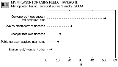 Of the 1.1 million people who used public transport at least once in the previous month, the main reason most given for using public transport was that it was more convenient than their own transport, it was less stress or it reduced their travel time (51%). Other reasons given were that they had no private form of transport (22%), it was cheaper than their own transport (12%), and they had public transport services near home (10%).