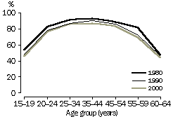 (b) Comprises permanent part-time and casual part-time workers, excluding self-employed people. (c) Comprises full-time casual and part-time casual workers, excluding self-employed people. (d) Includes self-employed people. A worker can be both casual and part-time and therefore components do not add to total. Source: Working Arrangements, Australia, 1997 (ABS cat. no. 6342.0); ABS Labour Force Surveys, July 1979 to June 2000. Men's and women's employment Both men's and women's employment rates reflect the changes outlined above. While the rate for men decreased between 1980 and 2000 (from 82% to 77%), the rate for women increased (from 47% to 61%). Over the period, the proportion of men who were employed was affected by the restructuring of industry and the resulting decline in permanent full-time positions. Even so, the pattern of male employment indicates that most men (62%) commence employment in full-time jobs during their early 20s and remain employed until they retire. Men's employment rates are lowest towards the beginning and end of their working lives - around the ages of 15-19 years and 60-65 years, reflecting participation in education and early retirement, respectively. Between 1980 and 2000, men's employment rates declined slightly across all ages, with the biggest fall in the 55-59 year age group where the rate declined from 81% to 70%. Between 1980 and 2000, women's employment rates rose substantially across all age groups. The exception was in the 15-19 year age group, where the employment rates of young men and women converged (46% and 50% respectively). The similarity of employment rates in this age group reflects the fact that many young people were in full-time education and not in the workforce. Changes in employment rates for women occurred alongside changing patterns of family formation, such as the delay in childbearing and reductions in family size (see Australian Social Trends 2001, Older mothers). The lower employment rates for women aged 25-34 years in 1980 compared with 2000, reflected the fact that women were more likely to take a break from paid employment to raise their family. The increase in part-time and casual employment, as well as the reduction in family size and expansion of child care services (see Australian Social Trends 2001, Child care arrangements) led to a decline not only in the number of women taking time out of the workforce but also the length of time they were out of the workforce (see Australian Social Trends 1998, Trends in women's employment). Consequently, the employment rate for women in the main childbearing years of 25-34 years increased, from 50% to 66% between 1980 and 2000. Between 1908 and 2000, relatively low proportions of women aged 55 years and over were employed compared with women in younger age groups. That said, the increasing propensity for women to enter and stay in the workforce was evident even among older age groups, as shown by the increased employment rate for those aged 45-54 years (from 46% in 1980 to 68% in 2000) and 55-64 years (21% to 34%).