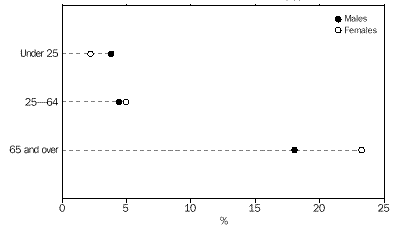 Need for Help: Older Persons All persons aged 60 years or more living in households were questioned about their need for help with home help, home maintenance, meal preparation, personal affairs and transport. This section considers help in relation to only those activities. There were 1,106,900 persons aged 60 years or more, living in households, who reported needing help with at least one of these activities. The activity where help was most frequently needed was home maintenance where 804,700 persons reported needing help. This was followed by a need for help with transport by 658,100 persons. Of the 1,106,900 persons aged 60 years or more, needing help, 760,400 or 68.7 per cent were persons identified as having a disability. Those persons with a disability needed most help in the area of home maintenance (613,100), whereas persons with no disability, of the same age, most frequently needed help with transport (203,800). Of all persons aged 60 years or more, with a disability, living in households 59.9 per cent reported needing help with one or more of the above activities. A larger proportion of females than males, aged 60 years or more living in households, reported a need for help. Females needing help represented 71.9 per cent of all persons needing help in that age group. However, females represented only 55.9 per cent of all persons aged 60 years or more living in households. Considering persons in households, in that age group with a disability, 50.7 per cent were females, but of those with a disability who reported needing help, 66.0 per cent were females. Both sexes reported home maintenance as the activity for which help was most frequently needed. Of persons in that age group with no disability (who reported a need for help), 84.8 per cent were females, with males most frequently needing help with home maintenance and females with transport. Over all age groups, more females reported needing help than males. This difference was greatest in the 75-79 year age group where 75.8 per cent of persons needing help were females, although they made up only 58.1 per cent of the total population, in households, in that age group. Principal Carers In 1993 there were 577,500 principal carers aged 15 years and over, who cared for a person with a handicap. This is 4.2 per cent of the Australian population aged 15 years and over. Of these principal carers, 425,200 cared for a person in the same household and 152,300 cared for a person who lived outside their household. For both usual resident and non-usual resident carers, females provided the majority of care. There were 273,700 or 64.4 per cent female carers and 151,500 or 35.6 per cent male carers who cared for another person in the same household. The difference was even greater for carers living outside the household with almost three quarters of the carers in this category being females. The predominance of female carers over male carers was consistent over all States and Territories, whether caring for a person in the same household or for a person in another household, with little fluctuation from the national average when caring for a person in the same household. Document Selection These documents will be presented in a new window.