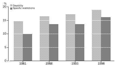 Sex and age The rate of disability increased with age, from 4% for children aged 0-4 years to 84% for those aged 85 and over. While the proportion of males and females with a disability was similar (around 19%), it varied across age groups. Males had similar or higher rates across all age groups except for those aged 80-84 years. In particular, disability rates for males were markedly higher for those who were young (0-14 years) or approaching older age (60-79 years). The greater proportion of females in the older age groups, where disability rates are higher, affects the overall disability rate for females. If both sexes were evenly distributed across age groups, males would have a disability rate of 20%, compared with 18% for females. Disability rates by age and sex, 1998 When the disability population is confined to people with a specific restriction, rates are again similar for males and females (17%). Differences between males and females are less marked across most age groups. Of the 1.1 million people with a profound or severe core activity restriction, 56% were female. Among older people, the rates of severe and profound disability were markedly greater for females. Profound/severe core activity restriction rate(a), 1998 (a) Standardised to March 1998 Australian population distribution Comparison over time There has been a steady rise in the underlying disability rate since the first disability survey in 1981. After adjusting for changes between surveys and in the age distribution of the population, the rate has increased from 15% in 1981 to 19% in 1998. This is underpinned by growth in the proportion with specific restriction from 10% to 16% in the same period. The greater part of the increase between 1993 and 1998 is for people with severe and profound restrictions. Age-standardised adjusted(a) disability and specific restrictions rates (a) Using common criteria, standardised to the March 1998 Australian population distribution States and Territories In 1998, the disability rate varied across States and Territories (13% in the Northern Territory to 22% in South Australia and Tasmania). When adjustments are made to account for differences in age distributions, the variation in disability rates decreased (from 18% in Victoria to 22% in Tasmania).