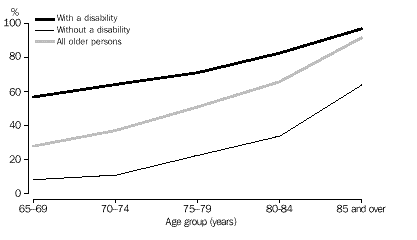 Underlying health conditions Disability usually exists as a consequence of disease, disorder or injury. In 1998, physical conditions, including musculoskeletal disorders such as arthritis, were the most common cause of disability (85%). However, 15% of people with a disability identified a mental or behavioural disorder as their main condition. Because of the greater numbers with physical disorders, most people with a severe or profound core activity restriction had a physical disorder as their main condition (78%). However, people whose main condition was a mental or behavioural disorder were more likely to be profoundly or severely restricted than those with a physical condition (47% compared with 29%). The vast majority of people with dementia had profound restrictions (94%). Of people with an intellectual or developmental disorder as the main condition, 47% were profoundly or severely restricted. Disorders reported as main condition causing disability, 1998 People reported a wide range of causes for the condition leading to their disability. The most commonly reported reasons were: 'Just came on/due to old age' (25%) and 'Accident or injury' (16%). For those with hearing disorders, 29% reported 'Working conditions, work or overwork' as the cause. Assistance In 1998, 57% of the 3.4 million people with a disability living in households needed assistance to move around or go out, shower or dress, prepare meals, do housework, light property maintenance or paperwork, or communicate. Most people in need of assistance received some help: 64% had their need fully met, and 32% partly met. However, there were 4% who felt their needs were not met at all. The proportion of people receiving help varied with the severity of restriction. People with profound or severe restriction who needed assistance were very likely to receive help; however, they were less likely to have their needs fully met than those with milder restrictions. Persons with a disability who need assistance, 1998 Most people with a core activity restriction received assistance from relatives and friends, chiefly partners, parents and children: 97% of people with profound or severe core activity restrictions and over 80% with moderate or mild restrictions received informal assistance. Formal providers of assistance such as home care workers and voluntary workers were used by just over half of the people with profound/severe (53%) or moderate (51%) restrictions. Older people In 1998, there were 2.3 million people aged 65 and over, including 976,500 who were aged 75 and over. The vast majority lived in private dwellings (91%), while a small proportion (7%) lived in cared accommodation such as nursing homes or aged care hostels. The remainder (2%) lived in other non-private dwellings, such as boarding houses. Of people aged 65 years and over, 54% had a disability. Nearly all older people in cared accommodation (97%) had a disability, and most (82%) had a profound core activity restriction. In contrast, 50% of older people in private dwellings and 54% in other non-private dwellings had a disability. The prevalence of profound core activity restriction was also lower in both these latter groups (9% and 11%). Need for assistance Less than half (46%) of all older people needed assistance. Older people's need for assistance with everyday activities increased with age regardless of whether or not they had a disability. Older people aged 85 or more had a markedly higher need for assistance than those aged 65-74 (92% compared with 32%). Older People's Need for Assistance by Age, 1998 Older people most commonly needed assistance with property maintenance and health care. Other common areas of need were transport, mobility, housework and self care. Family and friends were the main providers of assistance although 59% purchased or received formal help. Partners and children were the usual informal providers of help to older people. Of the 710,900 receiving informal assistance, 294,900 (41%) were assisted by partners, who were probably older people themselves. Activities where assistance needed by older people, 1998 (a) Need for assistance with personal activities was only collected from people with a disability. CARERS All providers of assistance In 1998, there were 2.3 million people who provided some assistance to those who needed help because of disability or ageing. Both males and females were well represented as carers, although a majority of these people were female (56%). Of those providing some assistance, 887,800 (38%) were in the 35-54 age range when caring responsibilities may involve children, partners and ageing parents. A further 181,100 were children under 18, and 133,300 were people aged 75 and over. All people providing assistance, 1998 Primary carers are those who provide most informal assistance with personal activities to a person with a disability and therefore caring plays a major part in their lives. In 1998, 19% (450,900) of all people providing assistance were primary carers, and most of these (70%) were female. Most primary carers (79%) cared for a person in the same household. Primary carers by age, 1998 COMING SOON Summary tables for each State and Territory will be released in May 1999. DISABILITY, AGEING AND CARERS: SUMMARY OF FINDINGS, AUSTRALIA, 1993 MAIN FEATURES INTRODUCTION This publication summaries the main findings of the 1993 Survey of Disability, Ageing and Carers, providing estimates of the numbers and main characteristics of persons with disabilities, persons with handicaps, persons aged 60 years or more and carers. The survey was conducted in private and special dwellings as well as in establishments such as hospitals, nursing homes, hostels and retirement villages. A person was identified as having a disability if he/she had one or more of a group of selected limitations, restrictions or impairments which had lasted, or was likely to last, for six months or more. (See glossary for more details on disa