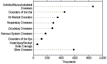 Also, in addition to asking questions on employment limitations of persons aged 15-64 years, the 1993 survey asked questions of persons aged 65 years and over, if they had not stated that they had retired. The effects of these changes, and other factors such as the population ageing, combined to show an additional 1.4 per cent of the population with a disability and an additional 1.2 per cent of the population with a handicap. If the 1993 survey had been conducted using categories identical to those used in 1988, analysis of this data shows that 16.6 per cent of the population would have been identified with a disability and 13.0 per cent with a handicap, compared with the 18.0 per cent for disability and 14.2 per cent for handicap reported in 1993. The 1988 survey found that there were 15.6 per cent of the population with a disability and 13.0 per cent of the population with a handicap. If the 1988 survey is standardised to the 1993 population, by multiplying the 1992 population in each age group by the proportion identifies as having a disability or a handicap in 1988 and summing the results, it shows that 16.0 per cent of the population has a disability and 13.4 per cent of the population had a handicap. Based on these calculations, it would seem that there has been a small increase in the proportion of persons with a disability (from 16.0% to 16.6%) and a small decrease in the proportion of persons with a handicap (from 13.4% to 13.0%). COMPARISON OF PROPORTIONS OF DISABILITY AND HANDICAP 1988, 1993 Actual 1993 data using 1988 data using Actual1993 data 1988 categories 1993 age structure 1988 data Disability 18.0 16.6 16.0 15.6 Handicap 14.2 13.0 13.4 13.0 Demographic Characteristics In 1993, of the 18.0 per cent (3,176,700) of the Australian population with one or more disabilities, 51.0 per cent were males and 49.0 per cent females. The distribution of disability across all States and Territories reflected the national figures, except in South Australia (20.6%), which was 2.6 per cent higher than the national average and the Northern Territory (12.3%), which was 5.7 per cent lower. The lower rate for the Northern Territory is due to the younger age structure. (See Glossary for Disability and Handicap Rates). For all age groups more males than females reported a disability (18.4 per cent and 17.6 per cent, respectively). However, the 60-64 year age group showed the largest difference with 43.2 per cent of males and 29.6 per cent of females reporting a disability. In 1993 95.0 per cent of persons with one or more disabilities lived in households, 18.7 per cent of these living alone. The proportion of persons living alone increases as age increases, both for persons with a disability and for persons without a disability. In the 0-24 year age group in households, 2.5 per cent of persons with a disability and 1.0 per cent without a disability live alone, compared with 39.9 per cent and 41.7 per cent respectively in the 75 year and over age group. Of all persons in households, 17.3 per cent have one or more disabilities, compared with 95.0 per cent of persons in establishments. Severity and Area of Handicap Of the 2,500,200 persons with a handicap, the most frequently reported area of handicap was mobility where 1,827,500 or 73.1 per cent reported mobility limitations. The next most frequently reported area of handicap was employment where 1,497,900 or 60 per cent of persons with a handicap reported employment limitations. Four levels of severity of handicap were identified for the 1993 Survey of Disability, Ageing and Carers - profound, severe, moderate and mild. The largest category was mild handicap with 941,800 or 37.7 per cent of all person with a handicap. Of all males with a handicap 160,000 (13.0%) has a profound handicap, 133,500 (10.9%) had a severe handicap, 226,200 (18.4%) had a moderate handicap, and 482,100 (39.3%) had a mild handicap. For females with a handicap 259,900 (20.4%) had a profound handicap, 167,600 (13.2%) a severe handicap, 229,200 (18.0%) a moderate handicap, and 459,600 (36.1%) a mild handicap. The remainder of persons with a handicap were classified as 'severity not determined'. This category includes persons who had a schooling limitation or an employment limitation only, children who were aged less than five years, or persons whose only limitation was 'does not use the toilet'. In all States and Territories the distribution of the area and severity of handicap was similar to the national estimates. There were 51,500 males aged 75 years or more, with a profound handicap, compared with 138,400 females, giving a sex ratio (males per 100 females) of 37.2. The sex ratio for persons aged 75 years or more, with a handicap, is 59.2 and for all persons in this age group is 60.2. Therefore, while some of the predominance of profound handicap in females is due to the age structure of the population, it cannot all be explained in this way. The remainder of the age categories, by the level of handicap, do not display any marked differences between males and females. Disabling Conditions Disabling conditions, such as respiratory diseases or mental disorders, were reported in response to a set of questions designed to identify the presence of a limitation, restriction or impairment. The main disabling condition is the condition, identified by a person with multiple conditions, as the condition causing the most problems. Where only one condition was recorded, this was considered to be the main disabling condition. Eleven categories have been used to group the main disabling conditions in this publication, with nine conditions classified as physical disorders. GRAPH 2: PERSONS WITH A DISABILITY, TYPE OF MAIN DISABLING CONDITION The conditions most frequently reported by persons with a disability were arthritis and other musculoskeletal conditions 27.2 per cent (863,300); disorders of the ear and mastoid process 14.2 per cent (450,000); all mental disorders 11.1 per cent (