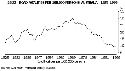 Attitudinal change has seen drink driving become largely unacceptable within the general Australian population. In 1990, Victoria made wearing of bicycle helmets compulsory, with the other States and Territories following through 1991 and 1992. At that time no other country had compulsory wearing of bicycle helmets. IMPROVED ENFORCEMENT TECHNOLOGY Enforcement technology, such as speed cameras, has made a major impact since being introduced in the late 1980s, first in Victoria and later in most other jurisdictions. Other innovations include laser based speed measuring devices and red light cameras. IMPROVED ROADS Australia's roads are today considered to be significantly safer than in the past. The Commonwealth Government's Black Spots programs have encouraged individuals and groups to nominate dangerous sections of road for specific improvement. Commonwealth funding has seen major upgrading of the National Highway. Other roads have been the target of considerable work by State and local governments in shoulder sealing, use of audible edge-lining and other delineation treatments, removal of roadside hazards and improved speed zoning. THE FUTURE All levels of government in Australia are heavily committed to reducing further the number and severity of road crashes and improving the efficiency of the road network. The turnaround that has been achieved in Australia's road safety performance since 1970 has highlighted the effectiveness of a resolute, coordinated approach by government. Notwithstanding the progress attained so far, much remains to be achieved. Recent work2 has suggested that a reduction to 860 annual road fatalities is potentially achievable by the year 2020. The Commonwealth, State and Territory Governments recently agreed to set a target of no more than 1,600 annual road crash deaths by the year 2005. While no level of crash death or injury is acceptable, this target is intended to focus efforts over the next few years. Road safety stakeholders have already set down a detailed road safety strategy and implementation plan3 for the immediate years ahead. This sets out a detailed plan of coordinated policies and legislation supported by enforcement, community involvement and public education activities. ENDNOTES 1 Bureau of Transport Economics 2000, Road Crash Costs in Australia. Report 102. 2 Vulcan, P. 1997, Predicting road fatalities for 2001 and beyond. Paper presented to the Road Safety Research and Enforcement Conference, Hobart, November 1997. 3 National Road Safety Strategy and Action Plan 1996, published by the Federal Office of Road Safety on behalf of the National Road Safety Implementation Task Force. Document Selection These documents will be presented in a new window.