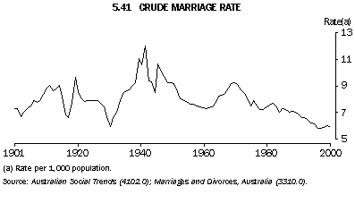 Marriages Marriage rates for the unmarried population (per 1,000 not currently married men or women aged 15 years and over) have also fallen over time.This long-term downward trend has been evident since these rates first became available in 1976. The marriage rate for men was 63 per 1,000 in 1976 while the rate for women was 61 per 1,000. In 2000 these rates fell to 34 and 32, respectively. Recent trends show that Australians are marrying later. The median ages of brides and bridegrooms at first marriage have increased from 21.1 and 23.4 years respectively in 1971 to 26.7 and 28.5 years in 2000 (graph 5.42). Part of this increase can be attributed to the increasing incidence of de facto marriages. Another factor is that young people are staying in education longer. In 2000, 65% of marriages had a groom older than the bride, and 23% of brides were older than grooms. However, there was a strong tendency for couples to be about the same age, with 44% of couples being within two years of each other, and only 8% being more than 10 years apart in age (graph 5.43). Table 5.44 brings together summary measures of marriages for Census years between 1901 and 1986, and individual years between 1990 and 2000.