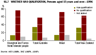 An urban population The Australian Indigenous population is becoming increasingly urbanised. 'Urban' is defined as a population centre of 1,000 or more people. At the 1991 Census, 67.6% of Indigenous people lived in urban areas; by the time of the 1996 Census this had increased to 72.6% (graph S1.4). In comparison, 85.1% of the total population lived in urban areas in 1991, increasing marginally to 85.9% in 1996 (ABS 1998c). By contrast, New Zealand Maori are more urbanised than Australia's Indigenous people, with 83.1% living in urban areas in both 1991 and 1996; this is very close to the proportion of the total New Zealand population residing in urban areas in both years (85.0%) (SNZ 1997b, 1997d). The urbanisation of Indigenous Australians does not reflect a mass movement to cities and towns by Indigenous people. Since the urban and rural classification is population based, some of the increase is a result of changes in classification of some smaller urban centres. Some of the increase is also a function of changes in the willingness of Indigenous Australians to identify themselves as such on the census form. This effect is more common in urban areas than in rural areas. There are differences in the types of urban centres in which Indigenous and other Australians reside. In 1996, Aboriginal and Torres Strait Islander Australians were less likely than the general population to be living in major urban areas of 100,000 or more people (30.3% of Indigenous people compared to 62.7% of the total population). On the other hand 42.3% of Indigenous people lived in smaller centres of between 1,000 and 99,999 people; in contrast, only 23.2% of the total population lived in smaller urban centres (ABS 1998c). Person characteristics Language The Australian Census asks each person which language he or she speaks at home. In 1996, 13.3% of Australian Indigenous people reported speaking an Indigenous language at home (ABS 1998c). In contrast, the New Zealand Census asks in which languages a person can carry on a conversation about everyday things. Of New Zealand Maori, 24.7% reported being able to carry on a conversation in the Maori language (SNZ 1997b). The Canadian Census, on the other hand, asks both language spoken at home and ability to carry on a conversation. A similar proportion of Aboriginal Canadians spoke an Aboriginal language at home as Indigenous Australians (15.0% and 13.3% respectively); at the same time a similar proportion of Aboriginal Canadians could carry on a conversation in an Aboriginal language as New Zealand Maori (29.3% and 24.7% respectively) (Statistics Canada 1998). In all three countries, indigenous language use was highest among older indigenous people and those living outside urban areas (ABS 1998c, SNZ 1997b, Statistics Canada 1998). In Australia, most Indigenous language speakers were concentrated in the north and west (map S1.5). Some areas where there were high numbers of not stated responses showed very low proportions of Indigenous language speakers. S1.5 INDIGENOUS LANGUAGE SPEAKERS, Proportion of Indigenous Population Source: 1996 Census of Population and Housing. Education Indigenous Australians were less likely to be attending an educational institution full-time than other Australians. In 1996, 73.7% of Indigenous 15 year olds were in full-time education compared to 91.5% of all 15 year olds (graph S1.6). At older ages the disparity between Indigenous and total persons increased, so that at age 19, when tertiary education could be expected to occur, only 12.0% of Indigenous persons were in full-time education, one-third the rate for total persons. The proportions of Aboriginal and Torres Strait Islander people and New Zealand Maori with a post-school qualification were very similar in 1996 at 13.6% and 14.3% respectively (graph S1.7). In contrast, 34.4% of the total population of Australia and 32.2% of the total New Zealand population had a post-school qualification (ABS 1998c, SNZ 1997b, 1997c). Indigenous people in major urban centres of 100,000 people or more were more likely to have a qualification than those in other areas (ABS 1998c). Labour force At the time of the 1996 Census, 52.7% of Australia's Indigenous population aged 15 years and over were in the labour force, in comparison to 61.9% of the total population of the same age group (table S1.8). Of the Indigenous labour force participants, 22.7% were unemployed, more than double the unemployment rate for the total population (9.2%). Thus, proportionally fewer Indigenous Australians were active in the labour force (that is, working or looking for work) and, of those in the labour force, proportionally fewer had a job. By contrast, there was virtually no difference in the proportions of both New Zealand Maori (65.3%) and the total New Zealand population (65.4%) in the labour force. The unemployment rate for Maori (17.5%), while lower than that for Indigenous Australians, was still more than double the rate for the total New Zealand population.