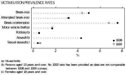 For the crimes that can be compared between the 1998 survey and the previous survey in 1993, there is little difference in the prevalence of victimisation or the rates of reporting crime to the police.