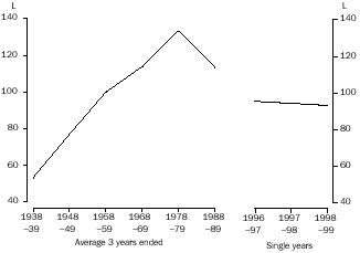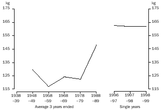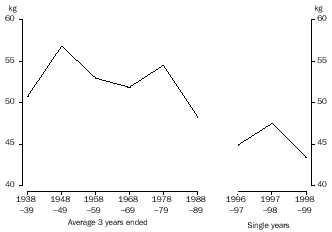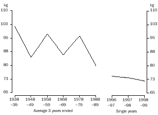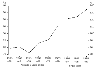 ABOUT THIS PUBLICATION Per capita consumption of meat and meat products In 1998-99 the per capita consumption of beef fell by 3.6% to 34.9 kg. This compares with a fall of 4.2% in 1997-98 when the consumption of beef was 36.2 kg per capita. Veal consumption fell 21.5% to 1.5 kg per capita in 1998-99 after a slight rise of 5.8% in 1997-98 to 1.9 kg. Consumption of beef and veal has been steadily decreasing since the peak consumption period of the late 1970s. The per capita consumption of lamb rose 6.6% to 11.8 kg in 1998-99, after a fall in 1997-98 of 0.6% to 11.0 kg. Since the late 1930s, lamb consumption has grown from a low of 6.8 kg to a 20.5 kg per capita peak in the late 1960s followed by a steady decline to the current level. The per capita consumption of mutton fell in 1997-98 by 5% to 5.7 kg. This was followed by a large decline in 1998-99 of 21.1% to 4.5 kg . This figure was 47.0% below the 8.4 kg per capita consumption recorded in 1993-94. The long term decline in the consumption of mutton reflects the increase in availability of more palatable substitutes such as lamb and chicken, as well as changes in consumer tastes. Consumption of pigmeat rose by 2.4% to 19.0 kg per capita in 1998-99. In the late 1930s the consumption of pigmeat was only 3.9 kg per capita. The per capita consumption of bacon and ham grew in 1997-98 by 3.0% and then remained steady in 1998-99 at 8.7 kg. This per capita consumption figure was 17.9% higher than the 1993-94 level of 7.4 kg. POULTRY The apparent per capita consumption of poultry increased by 3.8% in 1998-99 to a high of 30.8 kg. This was 9.4% up on the per capita consumption recorded in 1993-94. Poultry intake has more than trebled from the 8.3 kg per capita consumption derived in the late 1960s. SEAFOOD When compared with the previous year's apparent per capita intake of 10.8 kg the consumption of total seafood rose by 1.2% in 1998-99 to 10.9 kg. In 1998-99 the consumption of Australian fish fell by 7.0% to 3.6 kg per capita while consumption of imported fish rose by 7.8% to 4.5 kg. During this period (1998-99), the per capita consumption of crustacea and molluscs rose slightly by 3.9% to 2.9 kg. Since 1993-94 total seafood per capita consumption has risen 6.1%. This follows a longer term trend showing the consumption of seafood increasing dramatically since the late 1930s when intake was 4.9 kg per capita. DAIRY PRODUCTS Between the years 1997-98 and 1998-99 the apparent per capita consumption of total dairy products (excluding 'infants and invalids foods') increased slightly to 23.3 kg. The per capita consumption of full cream condensed, concentrated and evaporated milk remained constant at 0.4 kg between 1997-98 and 1998-99 but the skim milk component rose by 49.6% to 1.0 kg in 1998-99. Per capita consumption of powdered milk decreased considerably between the years of 1996-97 and 1997-98 with a reduction of 30.6% for full cream and 21.8% for skim milk. This was followed by a decrease of 3.3% for full cream powder in 1998-99 and a rise of 1.3% for skim milk powder in 1998-99. Per capita consumption of cheese rose by 0.5% to 10.7 kg in 1998-99 and market milk consumption dropped slightly, by 0.6%, to 102.4 kg per capita. FRUIT AND FRUIT PRODUCTS The apparent consumption of fruit (including fruit for fruit juices) increased by 8.3% to 135.0 kg per capita in 1998-99, following an increase of 2.6% to 124.7 kg in the previous year. The recorded per capita consumption has increased about 56.1% since the late 1960s and 71.5% since the late 1930s. Per capita consumption of fruit and fruit products: The increased consumption in 1998-99 was largely due to a 21.7% increase in the available per capita consumption of citrus of which oranges are the major component. Imports of fresh and processed oranges increased to 602,610 tonnes, 57.0% of the total supply while commercial production of oranges contributed 445,840 tonnes (42.0%) of supply. Per capita consumption of processed fruit rose by 0.9% to 6.8 kg while dried fruit consumption also rose by 4.1% to 3.0 kg per capita. In contrast to citrus the per capita consumption of other fresh fruit fell in 1998-99 by 0.5% to 55.4 kg. VEGETABLES In 1998-99 the total apparent per capita consumption of vegetables was 162.0 kg. This figure was up by 45.0 kg compared with the late 1950s when the recorded consumption was 117.1 kg per capita. Although per capita consumption of potatoes fell by 5.8% to 68.0 kg in 1998-99, it remains the most popular vegetable. Other root and bulb vegetables showed an increase of 2.9% during that period to a per capita consumption figure of 24.4 kg. The consumption of tomatoes increased to 24.9 kg per capita in 1998-99. This level of consumption was preceded by a fall in per capita consumption of tomatoes by 19.3% in 1997-98 to 20.9 kg followed by a rise in 1998-99 of 18.9%. The per capita consumption of leafy and green vegetables fell 6.5% in 1998-99 to 19.5 kg, following a decrease of 3.2% in 1997-98. The other vegetables group showed an increase in per capita consumption in 1998-99 up 4.6% to 25.1 kg per capita. Per capita consumption of vegetables EGGS AND EGG PRODUCTS Egg consumption declined in 1998-99 by 1.9% to 137 eggs per capita, compared with the previous year when consumption rose by 6.4% to 140 eggs. In the longer term, egg consumption has also shown a decline with intake considerably less than the 255 eggs available for consumption in the late 1940s. GRAIN PRODUCTS Wheaten flour available for consumption rose by 1.7% in 1997-98 to 68.4 kg per capita and again in 1998-99 up by 1.9% to 69.7 kg. Overall total breakfast food consumption has increased by 2.3% to 7.9 kg per capita in 1998-99. This correlates with an increase in both the consumption of oatmeal and rolled oats, up 2.2% to 1.0 kg per capita in 1998-99, and the per capita consumption of other breakfast foods (from grain), up 2.4% to 6.9 kg per capita. Rice per capita consumption has increased by 27.0% since 1993-94,