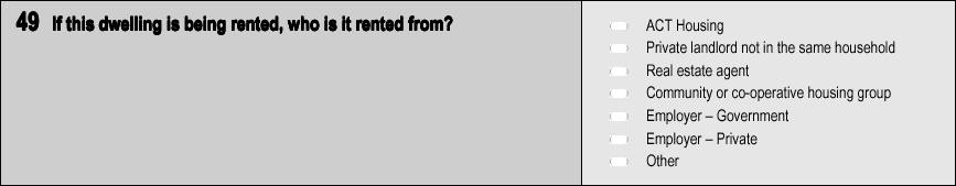 This variable provides information on the type of landlord for rented dwellings. It applies to all households who are renting the dwelling (including caravans, etc. in caravan parks) in which they are enumerated on Census Night. Landlord Type allows data to be produced for studies of the socioeconomic characteristics of tenants of public authority housing. It also allows for comparisons with tenants in privately owned accommodation. More Detailed Description