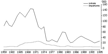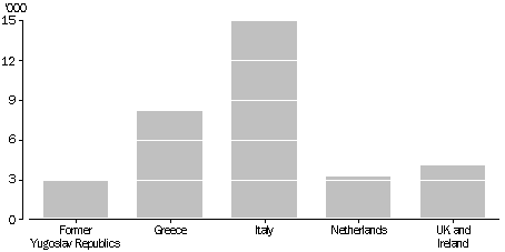 (b) Includes other countries of birth. Source: Census of Population and Housing (1901-1986) (unpublished data), Estimated Residential Population (1995p) (unpublished data). Emigration Some settlers emigrate from Australia after living here for a period of years. In 1972, emigration of European-born settlers peaked at 26,400. This was three years after immigration from Europe peaked at 145,400 settlers. In 1995, 4,900 European-born settlers left Australia. This reflects the lower numbers of European immigrants in 1992, 1993 and 1994 (see Australian Social Trends 1994, Emigration). There is no direct measure of the proportion of new settlers who emigrate within a year of their arrival. An approximation can be obtained by comparing the number of immigrants who arrived in one year with the number of emigrants departing in the same year, who stated that they had been in Australia for less than one year. Of the major birthplace groups in 1995, the largest ratio of former settlers emigrating within the same year, came from the United Kingdom and Ireland (24 for every 1,000 settlers). This compares to 8 of every 1,000 other Europeans. Some emigrants spend most of their working lives (paying taxes) in Australia then return to their country of birth, or another country, after retirement. In 1995, 34% of the European settlers leaving Australia had lived here for 20 years or more. PERMANENT ARRIVALS AND DEPARTURES OF EUROPEAN-BORN SETTLERS Source: Overseas Arrivals and Departures (unpublished data). Overseas pensions Australia pays full or partial pensions to many former Australian residents overseas, particularly in Europe, under shared responsibility agreements. In 1996, 40,800 (86% of all pensions paid overseas) were paid to European residents; 14,900 (32%) were paid to Italian residents and 8,200 (17%) were paid to Greek residents. The majority (88%) of pensions paid to European residents were age or disability support pensions. Data relating to overseas pensions do not identify all Australians receiving pensions overseas, as some countries, such as New Zealand and the United Kingdom, have host country agreements with Australia to pay pensions to Australian former residents, while Australia pays pensions to their former residents living in Australia. These agreements do not include portability arrangements for some Australian residents who qualify for a pension in Australia and subsequently migrate to another country, taking their pension with them. DISTRIBUTION OF AUSTRALIAN PENSIONS TO OVERSEAS RESIDENTS, JUNE 1996 Source: Department of Social Security, DSS Customers: A Statistical Overview, 1996. Europeans visiting Australia Although the number of permanent settlers from Europe has dropped markedly since the highs earlier this century, the number of Europeans visiting Australia has increased. In 1995, 752,000 short-term visitors arrived from Europe, over twice the number (347,000) in 1986. However most short-term visitors to Australia came from Asia (1.9 million in 1995). Thus while the number of European visits has increased, their proportion of all visits has declined over the last decade (from 24% to 20%). People travelling to and from Australia are asked to give the main reason for their trip. In 1995 almost half (49%) of all European visitors came to Australia for a holiday and 34% came to visit family or friends. Most of the remainder (11% of all European visitors), came for business or employment purposes. This pattern has changed since 1986, when there were proportionally fewer visitors coming to Australia for a holiday. Between 1986 and 1995 the number of European visitors coming to Australia for a holiday nearly tripled, while the number coming to visit family or friends almost doubled. Source countries of short-term visitors from Europe varied somewhat from those of permanent settlers. Approximately half of both settlers and visitors from Europe were from the United Kingdom and Ireland in 1995. However, 17% of short-term visitors were from Germany and 5% were from each of Italy, Switzerland, France and the Netherlands. In 1995, the United Kingdom and Ireland were the only countries in Europe from where more visitors came to visit relatives and friends (46%) than for a holiday (39%). In comparison, 73% of Swiss visitors and 71% of German visitors came for a holiday. 18% of French visitors came for business or employment reasons compared to an average of 11% for all European visitors. However, of all European visitors who came for business or employment reasons, 44% came from the United Kingdom and Ireland and 12% came from Germany. REASONS FOR SHORT-TERM VISITS TO AUSTRALIA BY EUROPEANS, 1995