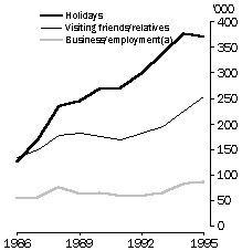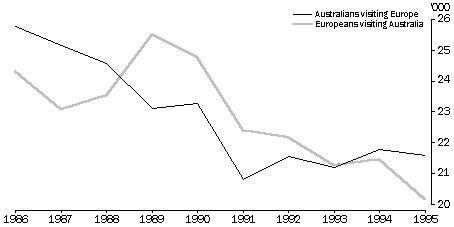 (b) Includes other reasons. Source: Overseas Arrivals and Departures (unpublished data). PROPORTION OF SHORT-TERM OVERSEAS VISITS TO AND FROM AUSTRALIA Source: Overseas Arrivals and Departures (unpublished data). Australians visiting Europe As for the number of European visitors to Australia, the number of Australians visiting Europe has also increased. Between 1986 and 1995 visitor numbers grew by 37%, from 397,000 to 544,000. In comparison, 939,000 Australians visited Asia in 1995, up from 497,000 in 1986. As a proportion of all departures, trips to Europe declined from 26% to 22%. In 1995 most Australians visiting Europe did so for a holiday (44%) or to visit family or friends (35%). 16% travelled for business or employment purposes. This pattern was similar in 1986 but the increase in the number of Australians visiting Europe for a holiday has not been as high as the increase in the number of Europeans visiting Australia for a holiday. Australians going to Europe for business or employment reasons increased from 46,900 in 1986 to 89,400 in 1995. The number of Europeans coming to Australia for short-term business trips also increased over the period, from 53,800 to 85,900. The main destination of Australian visitors to Europe was the United Kingdom and Ireland. 52% of all Australians visiting Europe went to these countries in 1995. A further 9% went to Italy and 6% went to Greece and Germany. Around half of the visitors to the United Kingdom and Ireland, Greece, Italy and France were for holidays. In comparison, one quarter of visitors to Germany were for holidays, 33% were for business or employment purposes and 36% were to visit friends and relatives. REASONS FOR SHORT-TERM VISITS TO AUSTRALIA BY EUROPEANS (a) Includes visits for conferences and conventions. Source: Overseas Arrivals and Departures (unpublished data). REASONS FOR SHORT-TERM VISITS TO EUROPE BY AUSTRALIANS (a) Includes visits for conferences and conventions. Source: Overseas Arrivals and Departures (unpublished data). Investment with Europe The changes in Australia's relationship with Europe can be measured not only in the number of people moving between Australia and Europe, but also in the levels of trade and investment between Australia and Europe. At 30 June 1995, Australia had $141.2 billion invested overseas, 36% of that in Europe. At the same time, European investment in Australia made up 30% of total overseas investment in Australia. The respective proportions were much the same in 1990. Thus in terms of investment our overall relationship with Europe has changed very little in the last five years. In 1995, the United Kingdom accounted for 19% of investment in Australia and 20% of Australian investment overseas. The only country in which Australian investment overseas was greater (and whose investment in Australia was also greater) was the United States of America. The European country with the highest investment in Australia other than the United Kingdom, was the Netherlands. In 1995, 3% of investment in Australia was from the Netherlands. AUSTRALIA'S INVESTMENT POSITION AT 30 JUNE 1995