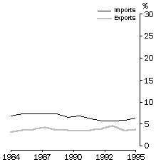 Trade with Europe Overall, the proportion of Australia's trade with Europe throughout the last decade has declined slightly. In relative terms, our exports to the European Union have dropped from a peak of 16% of total exports in 1986-87 to 11% in 1995-96. Our imports from the European Union have also dropped from 27% of total imports in 1985-86 to a low of 22% in 1992-93 before rising again to 25% in 1995-96. The balance of trade between Australia and the European Union has grown more in favour of the European Union as the gap between imports and exports has increased. The United Kingdom continues to be an important trading partner, receiving 4% of our exports, while 6% of our imports came from there in 1995-96. A further 6% of our imports came from Germany. While the balance of trade remains in favour of the United Kingdom, the gap between imports and exports has narrowed over the decade. TRADE WITH THE EUROPEAN UNION Source: International Merchandise Trade, Australia (cat. no. 5422.0). TRADE WITH THE UNITED KINGDOM Source: International Merchandise Trade, Australia (cat. no. 5422.0). Endnotes 1 Department of Foreign Affairs and Trade (DFAT) 1996, Australia's Trade with the European Union 1995, DFAT, Canberra. 2 Jupp, J. (ed.) 1988, The Australian People, for the Australian Bicentennial Authority, Angus and Robertson. 3 Eurostat 1989, Europe in Figures, 2nd edition, Eurostat, Brussels–Luxembourg. 4 British nationals were not necessarily born in the United Kingdom and Ireland. Some may have been born in Commonwealth countries (other than Australia), such as New Zealand. Prior to 1959 nationality, not country of birth, was recorded for immigrants to Australia.