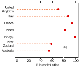 Source: ABS 1996 Estimated Resident Population by Country of Birth. Most States had high concentrations of older overseas-born Australians from specific countries. For example, 43% of older Australians born in Greece, 40% born in Italy and 37% born in Poland lived in Victoria. New South Wales had a very high concentration of older people born in China (57%). In South Australia, there were higher proportions of those born in the United Kingdom and Greece (both 13%) and Poland and Italy (both 12%) than of all older overseas-born Australians (10%). While Queensland had a relatively small proportion of older overseas-born Australians overall (13% compared with 19% of the older Australian-born population), over one-third (36%) of the older New Zealand-born lived there. Of older overseas-born Australians, the distribution of those born in the United Kingdom was most similar to that of older people born in Australia. The older overseas-born population is more highly urbanised than older people born in Australia, with almost 80% living in capital cities in 1998, compared with 54% of the Australian-born. Those born in China and Greece were the most likely to live in capital cities (99% and 94% respectively), while those born in New Zealand were the least likely to live in the capital cities (58%). PROPORTION OF OLDER AUSTRALIANS IN CAPITAL CITIES, SELECTED COUNTRIES OF BIRTH - 1998 (a) Excludes SARs and Taiwan Province. (b) Total older overseas-born Australians. Source: ABS 1998 Survey of Disability, Ageing and Carers. Living arrangements Families are a major source of emotional and financial support. In Australia, most care for older people needing assistance is provided informally by family members, particularly partners and children. Living arrangements and the presence of family nearby thus has an impact on the level of support upon which older people can rely. Despite the disrupting effect that immigration can have on families, by reducing the number of family members available to offer help, in 1998 older overseas-born Australians were more likely to be living with family members than those who were born in Australia (70% and 58% respectively).3 This is a reflection of the higher proportion of the older overseas-born who were married (60% compared with 53% of the Australian-born), along with lower proportions who were widowed (31% compared with 35%) and living alone (21% compared with 30%). Those born in Greece and the Former Yugoslav Republics were the most likely to be married (both around 75%) and to be living with family members (both over 80%). SOCIAL AND HEALTH CHARACTERISTICS OF OLDER AUSTRALIANS - 1998