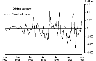 2.43. It is difficult when viewing the original quarterly balancing item series to identify whether the volatility in the series is offsetting in either the short term or long term. A useful way to examine swings is to apply a seven-term Henderson moving average to the balancing item. This has been done in Graph 1, which shows the original quarterly balancing item and a derived trend series. The graph shows that there are sharp quarterly swings in the original balancing item series but that the trend series appears to move through cycles of about six or seven quarters when a positive balancing item predominates followed by a similar period during which a negative balancing item predominates. Further analysis would be needed to establish whether there is any relationship between these swings and movements in other economic variables such as interest rates and exchange rates, but there does seem to be a cyclical component.