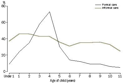 The pattern of formal child care varies considerably with age. Among children aged 0-2 years, 22% received some type of formal care in 1999, with more than half of these attending long day care centres. In contrast, 66% of 3-4 year olds received some type of formal care. Preschool was the major type of care received, with 36% of children in this age group attending, followed by long day care (24%). Children aged 5-11 years were less likely to receive formal care (12%) than younger children, and were most commonly attending before and after school care programs (8% of this age group).