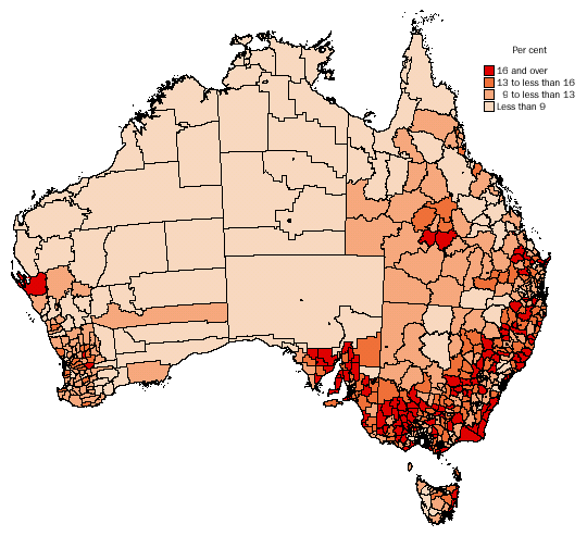Falling fertility, increased life expectancy and the redistribution of the population through internal migration have resulted in some parts of Australia ageing more rapidly than others. Similar to large scale population ageing, regional population ageing has implications for the provision of, and distribution of funding for, public services. For example, regions with a large number of older people may have a greater need for specialised health services, home help, public transport and smaller housing than regions with a younger population. This article highlights patterns of regional population ageing by examining the proportion of people aged 65 years and over across statistical local areas (SLAs).