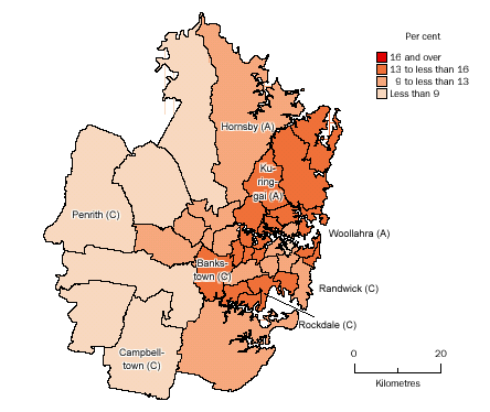 Sydney is a typical example of these patterns. Sydney's age structure is similar to the national average, although in 2000 there was no SLA within its boundary with more than 16% of its population aged 65 years and over. However, typical patterns of metropolitan population ageing were still apparent. The proportion of people aged 65 years and over tended to be higher in the band of SLAs where suburbs were developed during the mid-20th century. Examples of these SLAs include Ryde and Ku-ring-gai in northern Sydney (14% and 15% respectively), Strathfield (15%) to the west of the city and Rockdale (just under 16%) in the south.