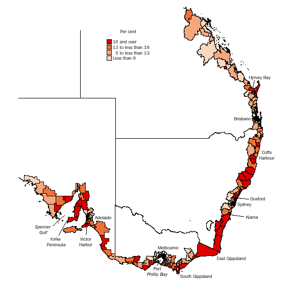 In South Australia, older coastal SLAs (those with at least 16% of their population aged 65 years and over) extended along both sides of Spencer Gulf and Yorke Peninsula, to Victor Harbor, south of Adelaide. In Victoria, older populations were located along the coastline of Port Phillip Bay, and the south- east coast of Victoria from South Gippsland to East Gippsland at the New South Wales border. This trend continued along the south coast of New South Wales to Kiama, south of Sydney. Many parts of the north coast of New South Wales also had a high proportion of older residents, with most SLAs from Gosford to Hervey Bay in Queensland having more than 13% of their populations aged 65 years and over, and many of them, more than 16%.