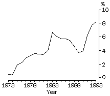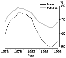 AGE PENSIONERS, 1993 Source: Department of Social Security AGE PENSIONERS AS A PROPORTION OF AGED PEOPLE(a) (a) Males aged 65 years and over and females aged 60 years and over. Source: Department of Social Security Annual Report; Estimated Resident Population Unemployment benefit The Commonwealth unemployment benefit scheme was introduced in 1945 and replaced ad-hoc relief provided by State governments and charities. It was introduced at the start of the period of post-war reconstruction when full employment was both the ideal and the reality2. Between 1946 and 1951, the number of people receiving the unemployment benefit averaged less than 3,000. The eligibility criteria for the unemployment benefit have changed over time. In 1988 the Job Search Allowance (JSA) replaced the unemployment benefit for 16-17 year olds. This allowance is paid at the same rate as educational allowances and therefore created a neutral system of allowances. Currently the JSA covers 16-17 year olds and older people during their first year of unemployment. For people aged over 18 years who have been unemployed for 1 year or longer the Newstart Allowance (NSA) is payable. This incorporates agreements on appropriate job search, employment and/or training activities. In the following discussion, these two allowances are combined under the general heading of unemployment benefits. Since the early 1970s, periods of recession have considerably increased the number of people receiving the unemployment benefit. In 1973, 37,000 people (0.5% of the working age population) received the unemployment benefit. In June 1993, 914,000 (8% of the working age population) received the benefit. Comparing the age distributions of people receiving the unemployment benefit in 1973 and 1993 shows that there has been a shift away from youth towards older age groups. The recession in the early 1970s, the first serious recession since the great depression, particularly affected employment opportunities for younger people (under 21 years), and they formed the majority of people who received the unemployment benefit in 1973. By the 1990s, further recessions had affected a wider range of age groups and, along with increasing duration of unemployment, a greater proportion of those receiving unemployment benefits were aged 21-44 years. Another factor in the reduction in the share of those under 21 years is the increased education participation of this age group both at secondary and tertiary level (see Education - National summary tables). The proportion of people in receipt of the unemployment benefit for longer than 6 months has increased over the past two decades. In 1973, 18% of unemployment benefit recipients had been receiving the benefit for 6 months or longer. In 1993 the figure was 57%. For a more detailed review of duration of unemployment see Long-term unemployment. PEOPLE RECEIVING UNEMPLOYMENT BENEFIT(a) (a) Job Search Allowance/Newstart Allowance in 1993. Source: Department of Social Security Annual Report and Ten Year Statistical Summary PEOPLE RECEIVING UNEMPLOYMENT BENEFIT AS A PROPORTION OF THE WORKING AGE POPULATION(a) (a) Males aged 16-64 years and females aged 16-59 years. Source: Department of Social Security Annual Report; Estimated Resident Population Disability support pension The disability support pension is the main means of income support for people who have disabilities that preclude them from supporting themselves by paid employment. This pension was previously known as the invalid pension and was introduced in 1910 as a result of the Invalid and Old-age Pensions Act 1908. The pension provides income support for people aged 16 years and over who are permanently incapacitated for work. It is paid at the same rate as the age pension and is currently means and assets tested3. The qualification of permanent incapacity for work was originally taken to mean totally and permanently incapacitated for work but this was amended in the 1940s to stipulate that claimants must be permanently incapacitated for work to the extent of 85%3. The Disability Reform Package, announced in the 1990-91 Federal Budget, emphasised active measures designed to assist people with disabilities into employment rather than place them on long-term income support. The invalid pension was renamed, becoming the disability support pension and eligibility criteria were changed. The concept of 85% permanent incapacity for work was replaced by an inability to work for at least 30 hours a week at full award wages for at least the next two years due to physical, intellectual or psychiatric impairment, and a minimum impairment threshold of 20% was introduced4. In June 1993 there were 292,000 men (5% of working age men) and 115,000 women (2% of working age women) receiving a disability support pension. The corresponding figures for 1973 were 85,000 and 64,000 respectively. These increases represent an annual average growth rate over the period of 6% for men and 3% for women. However, during this 20 year period, the number of women receiving a disability support pension remained relatively stable until the mid-1980s while the number of men receiving the pension increased at a fairly constant rate except during the early 1980s when a change in administrative guidelines temporarily halted the increase in numbers3. The majority of men (62%) in receipt of the disability support pension in 1993 were aged 50 years or over and thus approaching retirement age. Women in receipt of the disability support pension had a similar pattern with numbers increasing with age. However, the proportion aged 50 years and over (39%) is not comparable with that for men because disabled pensioners generally move on to the age pension at 60 years for women and 65 years for men. The considerable difference between the numbers of men and women receiving a disability support pension may be partly due to the alternative benefits a woman with a disability may be entitled to claim (e.g. widow