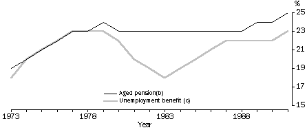 Source: Department of Social Security Annual Report SOLE PARENT PENSIONERS Source: Department of Social Security Annual Report and Ten Year Statistical Summary SOLE PARENT PENSIONERS, 1993 Source: Department of Social Security Annual Report Relative income Changes in the rates at which government pensions and benefits have been paid have generally been linked to changes in the cost of living as measured by the consumer price index. Depending on government policy the indexation has either been automatic or a special budget item. Other ad-hoc increases have been made from time-to-time to bring about desired increases over and above those related to the cost of living. The age and disability support pensions have always been paid at the same rate but the married unemployment benefit rate was not made equivalent to the married age pension rate until 1973. At the same time the widow pension was set to the same rate as the age pension, and the supporting mother's benefit (now the sole parent pension), also paid at the same rate, was introduced1. Throughout the 1950s and early 1960s the age pension maintained value relative to the cost of living at about 22% of average weekly male earnings (AWME). However, by 1970, wages growth had caused the value to decline to 18% of AWME. In 1973, the government announced its intention of increasing the basic pension rate by gradual increments until it reached 25% of AWME1. By 1976 the standard age pension rate had reached 23% of AWME. From 1977 to 1989, the pension value was maintained at 23-24% of AWME. In 1990 the current target figure of 25% of AWME was reached and has been maintained since. In 1973, the government removed the age related differences in unemployment benefit rates, making the single (no dependants) rate of unemployment benefit the same as the rate of the standard age pension. However, later changes to unemployment benefit rates again differentiated on the basis of age. In 1978-79 the government removed the automatic indexing of unemployment benefits for single people without dependants, reverting to an annual budgetary review. From then until 1983, the value of the single independent unemployment benefit declined relative to AWME, from 24% to 18%. Although the rate increased from 1983 to 21% of AWME in 1986, the single independent unemployment rate and the standard age pension rate have maintained a gap of 2-3 percentage points of AWME in favour of the age pension. SELECTED BENEFITS AND PENSIONS AS A PROPORTION OF MALE ORDINARY TIME AVERAGE WEEKLY EARNINGS(a) (a) Based on original quarterly average weekly earnings data. (b) Standard rate (c) Single independent rate (aged 21 years and over) Source: Department of Social Security Annual Reports; Survey of Average Weekly Earnings Endnotes 1 Kewley, T. H. (1980) Australian Social Security Today: major developments from 1900 to 1978 Sydney University Press. 2 Cass, B. (1988) Income support for the unemployed in Australia: towards a more active system Issues Paper No. 4, Social Security Review. 3 Cass, B et al. (1988) Towards enabling policies: income support for people with disabilities Issues Paper No. 5, Social Security Review. 4 Department of Social Security Annual Report 1990-91. 5 Raymond, J. (1987) Bringing up children alone: policies for sole parents Issues Paper No. 3, Social Security Review.