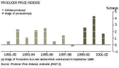 The producer price index for final commodities recorded a 8.7% increase between September quarter 1998 (the start of the stage of production series) and the June quarter 2002. Prior to September quarter 1998 the articles produced by manufacturing industries index was the headline producer price index indicator.