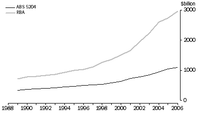 In the 2004-05 ASNA, ABS estimates of the value of land were revised, increasing the proportion of land allocated to the household sector, and increasing the economic lives of some categories of dwellings. The effect of the revisions was to increase the total value of dwellings and land owned by the household sector. However, when commercial and rural land are excluded, the revised estimates were still significantly below those published by the RBA in table B20 of its monthly Reserve Bank of Australia Bulletin, and a divergent trend over time is evident (see graph below).