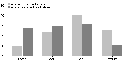 Of people who did not complete the highest level of secondary school available, most (70%) had poor or very poor prose skills. By comparison, 66% of those who completed the highest level of secondary school but obtained no post-school qualification were at Level 3 or higher. This was a higher proportion than those with vocational qualifications (54%). However, many of those with vocational qualifications did not complete the highest level of secondary school.