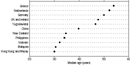 Of the top 12 overseas birthplace groups in 1996, the Italian born had the oldest age profile (median age 57 years) followed by those from Greece, the Netherlands and Germany, all with median ages of 50 years or older. In contrast New Zealanders and the more recently arrived Asian groups (people from the Philippines, Viet Nam, Malaysia and Hong Kong) were the youngest, with median ages below 35 years.