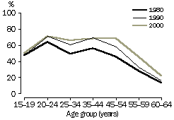 Over the period, the proportion of men who were employed was affected by the restructuring of industry and the resulting decline in permanent full-time positions. Even so, the pattern of male employment indicates that most men (62%) commence employment in full-time jobs during their early 20s and remain employed until they retire. Men's employment rates are lowest towards the beginning and end of their working lives - around the ages of 15-19 years and 60-65 years, reflecting participation in education and early retirement, respectively. Between 1980 and 2000, men's employment rates declined slightly across all ages, with the biggest fall in the 55-59 year age group where the rate declined from 81% to 70%.