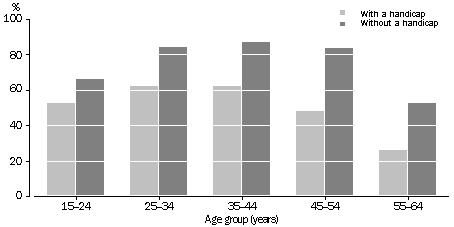 Working-age people with disabilities and handicaps The 1993 Survey of Disability, Ageing and Carers found that, after excluding people who lived in institutions, 15% (1.7 million) of working-age people (i.e. aged 15-64) had a disability. This includes people with relatively minor impairments which are unlikely to affect their employment opportunities in any significant way. Most people with a disability also had a handicap (1.3 million or 11% of working-age people). The proportion of working-age people with a handicap increased with age, from 5% among those aged 15-24 to 26% among those aged 55-64. Of working-age people, 2% (288,000) had a severe or profound handicap, representing about one quarter (23%) of those with a handicap. The proportion of working-age people with a severe or profound handicap also increased with age, from 1% of those aged 15-24, to 5% of those aged 55-64. LABOUR FORCE PARTICIPATION RATES OF WORKING-AGED PEOPLE, 1993 Source: Disability, Ageing and Carers, Australia: Summary of Findings (cat. no. 4430.0 and unpublished data). People permanently unable to work In 1993, 3% of working-age people (391,000) were permanently unable to work, representing about one third (31%) of those with a handicap. Half of these (194,000) were aged 55-64. People's ability to work is affected by the nature of their condition. Among people with a handicap, 62% of those whose main disabling condition was mental psychosis were permanently unable to work, compared to 30% of those whose main condition was of a physical nature. A higher proportion of younger than older people with a handicap had a main disabling condition which was related to a mental, rather than a physical disorder, and this was also the case for people who were permanently unable to work. Among those who were permanently unable to work, 53% of those aged 15-24 had a main disabling condition that was a mental disorder, compared to 6% of those aged 55-64. In contrast, older people were more likely to be affected by various physical impairments, particularly arthritis and other musculoskeletal conditions. WORKING-AGED PEOPLE, 1993