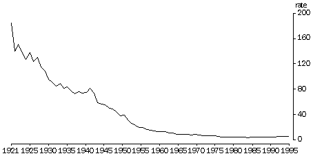 One of the most dramatic declines in death rates has been for tuberculosis. Age-standardised death rates from tuberculosis fell from 75 per 100,000 in 1921 to 0.4 in 1995.