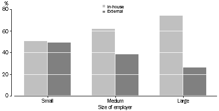 Source: Employer Training Expenditure, Australia, July-September 1996 (cat. no. 6353.0). In-house and external training Structured training provided by employers for their employees can be either in-house or external. In-house training courses are those organised by an employer primarily for their own employees, and are usually conducted by the employer's training staff or training consultants. External training courses are those organised and conducted by outside training or educational institutions, agencies or consultants. In the September quarter of 1996, 70% of total training expenditure was spent on in-house training ($825 million) and 30% on external training ($354 million). Employees received an average of 3.1 hours of in-house training and 1.8 hours of external training per person over this three-month period. The proportions of training expenditure and training hours per employee for in-house and external training did not change between 1993 and 1996. In 1996, large employers spent a greater proportion of their total training expenditure on in-house training (74%) than medium (62%) and small employers (51%). This is most likely because in-house training is more economically viable for large organisations.