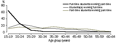 The ages of students across the different combinations of study and work varied considerably. In 2000, most full-time students working part-time (89%) were aged under 25 years. However, students working full-time were typically older (63% were aged 25 years and over), while part-time students working part-time were distributed in similar proportions across the ages of 15 to 54 years.
