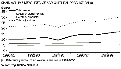 Changes in the volume of aggregate agricultural production over time can be obtained using chain volume measures. Between 1990-91 and 1999-2000, the volume of agricultural production increased by 39%. During this period, the volume of total crop output increased by 68%, livestock slaughterings increased by 25%, while livestock products returned to the 1991 level after a decade of lower production.