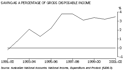 Australia's gross disposable income in 2001-02 was $695b. (The difference between this amount and GDP mainly reflects net income and current transfers payable to non-residents.) Of this, $560b was spent on final consumption expenditure. After allowing for consumption of fixed capital (depreciation) of $112b, this left net saving of $24b (or 3.5% of gross disposable income). During the last 10 years the proportion of gross disposable income saved ranged from a low of -0.2% in 1991-92 to a high of 3.8% in 1997-98, and 1999-2000.