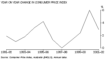 The consumer price index (CPI), a measure of inflation, increased by 2.9% in 2001-02 compared with 2000-01. Over the same period, the GDP chain price index - which provides a broader measure of inflation than the CPI - increased by 2.5%. In 2000-01, the CPI was directly affected by the introduction of a goods and services tax, which replaced wholesale sales tax and some state and territory taxes. Hence the annual growth rate of 6.0% in 2000-01. From 1991-92 to 2001-02 the average annual rate of change in the CPI was 2.4%.